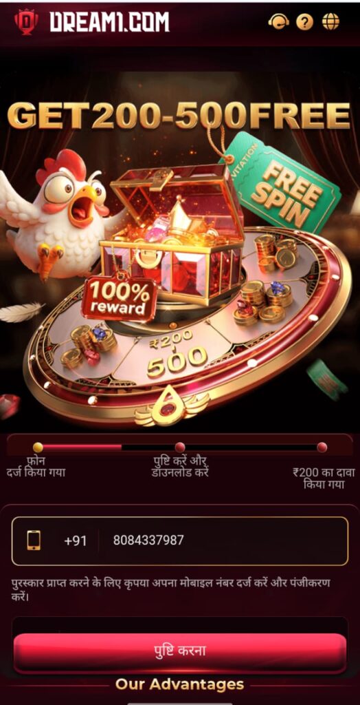 - Install the dream 1 APK on your smartphone, keeping all the terms and conditions in mind. Sign up with your phone number and verify it using the OTP. Upon verification, you will instantly receive a bonus of ₹500 to ₹5777, which you can easily use to play games.